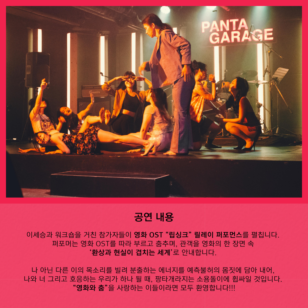 이세승과 워크숍을 거친 참가자들이 영화 OST “립싱크” 릴레이 퍼포먼스를 펼칩니다. 퍼포머는 영화 OST를 따라 부르고 춤추며, 관객을 영화의 한 장면 속 ‘환상과 현실이 겹치는 세계’로 안내합니다.