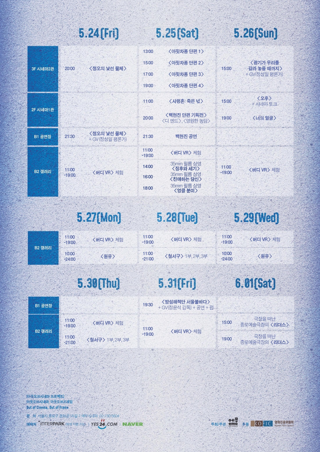 2019년 5월 24일 금요일부터 6월 1일 토요일까지 복합문화공간에무에서 <아웃오브시네마, 아웃오브프레임> 기획전에 영화진흥위원회 후원을 받아 대규모로 열린다.