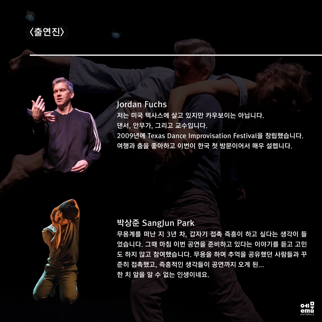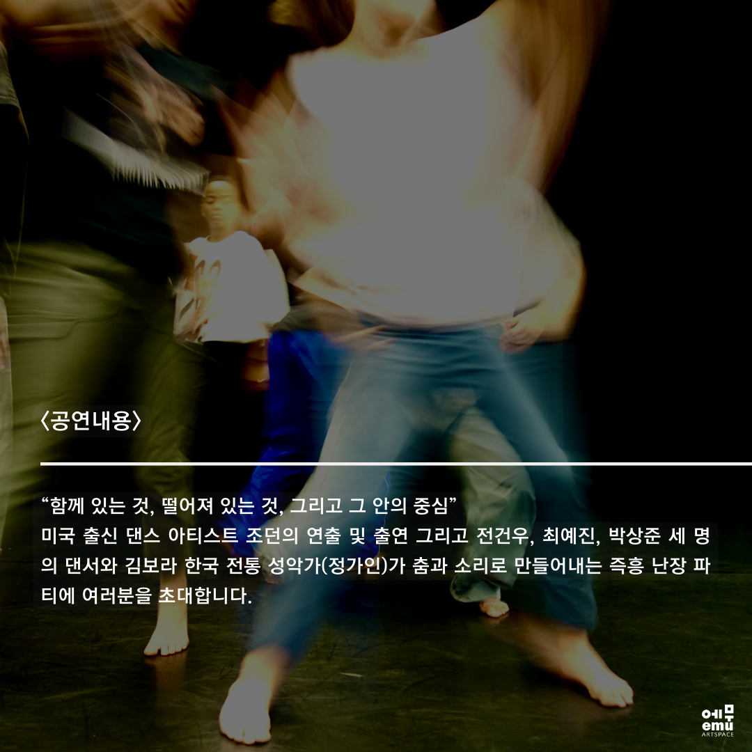 미국 출신 댄스 아티스트 Jordan Fuchs와 세명의 댄서, 그리고 한국 전통 성악가가 함께하는 즉흥 난장 파티에 여러분을 초대합니다!